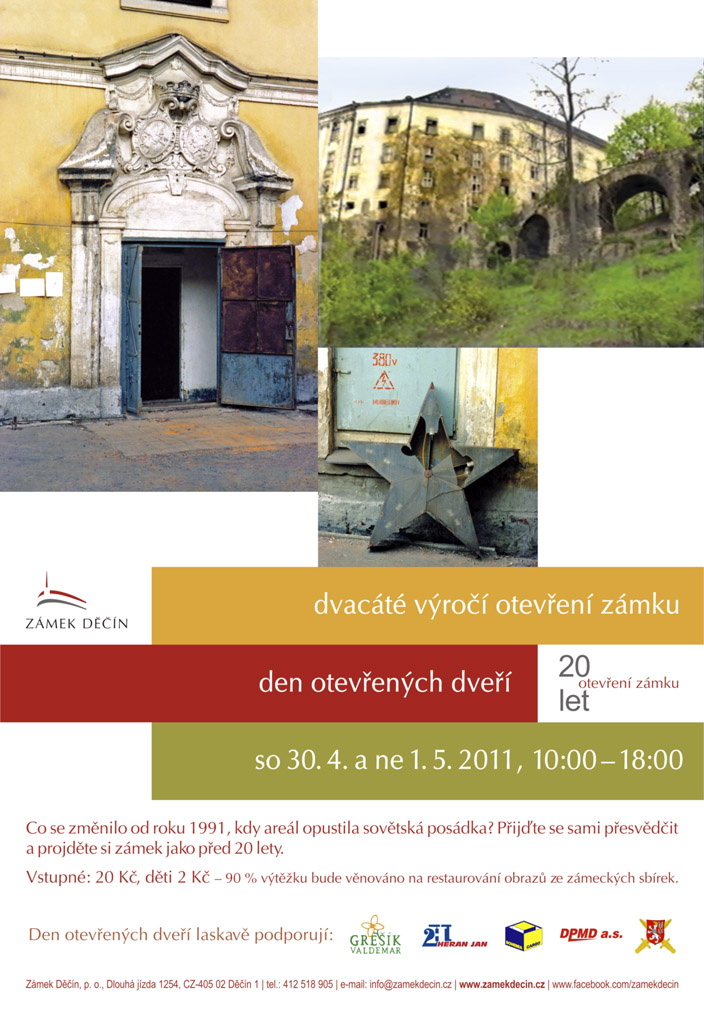 Den otevřených dveří – připomínka 20 let od prvního porevolučního otevření děčínského zámku, se uskuteční v sobotu 30. dubna a v neděli 1. května, vždy od 10 do 18 hod. Symbolické vstupné 20 Kč bude věnováno do veřejné sbírky na restaurování obrazů z původních zámeckých fondů.
