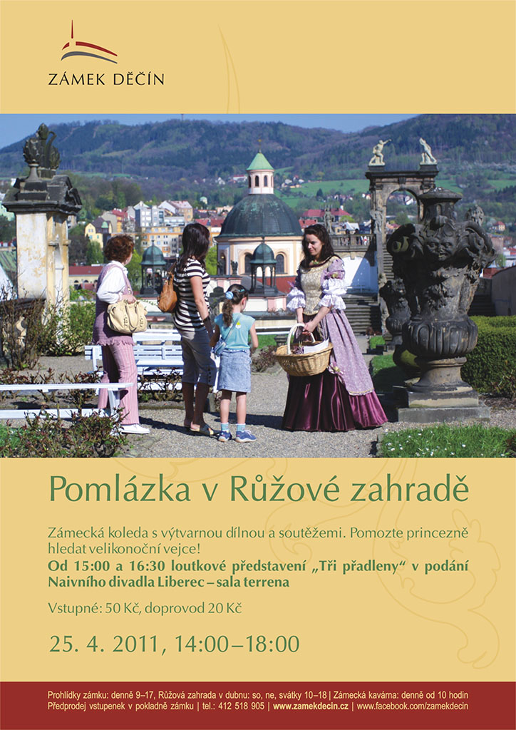 Na Pondělí velikonoční 25. 4. zveme do Růžové zahrady všechny děti na zámeckou koledu. Setkají se s princeznou a princem a pomohou jim nalézt poztrácená velikonoční vejce. Připravena bude také výtvarná dílna a soutěže. V 15:00 a 16:30 hodin se mohou těšit na loutkové divadelní představení „Tři přadleny“ v podání skvělého Naivního divadla Liberec.