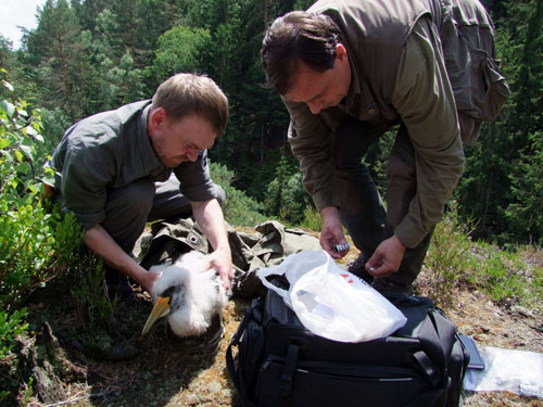 České Švýcarsko, 10. 6. 2011 – V uplynulém týdnu provedli pracovníci Správy Národního parku České Švýcarsko kroužkování mláďat čápů černých. Okroužkována mohla být tři mláďata na skalním hnízdě. Označení mláďat pomocí kroužků, které lze na dálku snadno odečíst dalekohledem, přináší podrobné poznatky o životě a migraci tohoto plachého a vzácného druhu čápů. Přestože se v širší oblasti Českého Švýcarska pravidelně vyskytuje sedm až osm čapích hnízd, podařilo se v letošním roce zjistit přesnou polohu pouze ve dvou případech.
