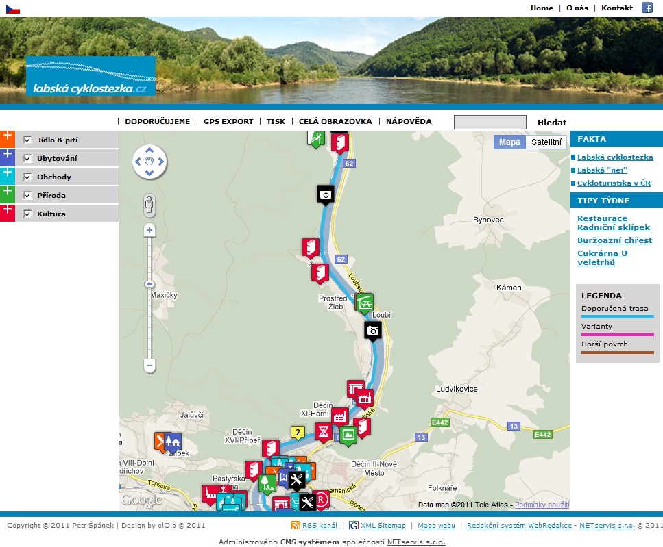 Web podrobně mapuje charakter labské cyklostezky, kvalitu povrchu, problematická místa a nabízí i možné varianty k doporučené trase. Pro zobrazení využívá mapy od Googlu, ve kterých je zakreslena trasa od německých hranic až do Prahy. A na ní spousta zajímavostí. Autor se zaměřil na zmapování bezprostředního okolí cyklostezky, především na úseky mezi městy, které jsou méně známé. V druhé fázi chce přidat i informace o městech. Na většině míst, která se v mapě nacházejí, autor sám byl. Buď je objevil, nebo mu je doporučili přátelé. Ta nejlepší místa zařadil do kategorie Doporučujeme.