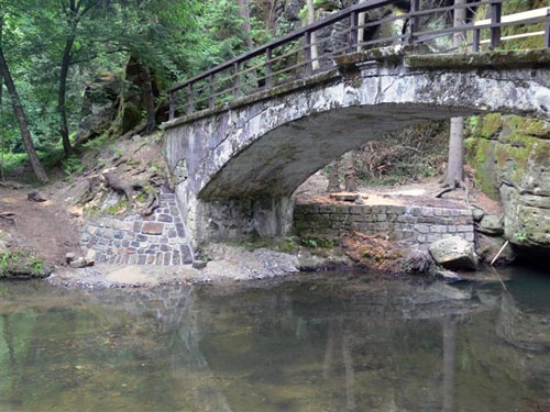 Jetřichovice, 23. 6. 2011 – Klenutý železobetonový mostek, který se nachází nedaleko Dolského mlýna u Královského smrku, má od minulého týdnu opravené pilíře. K jejich podemletí a částečnému poškození došlo během opakovaných povodní v loňském roce. Oprava pilířů mostku proběhla bez přerušení provozu na turistické trase a cyklostezce č. 3076.