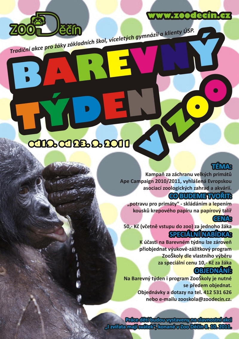 Už příští týden odstartuje děčínská zoo tradiční akci pro školáky – Barevný týden v zoo. Tato „výtvarná dílna pod širým nebem“ je určena především žákům základních škol, víceletých gymnázií a klienty ÚSP. Koná se na podporu kampaně za záchranu velkých primátů „Ape Campaign 2010/2011, kterou vyhlásila Evropská asociace zoologických zahrad a akvárií. Děti čeká tentokrát tvoření z krepového papíru, budou připravovat „potravu pro primáty“. Cena za jednoho žáka pro účast na Barevném týdnu je 50 Kč (včetně vstupu do zoo). Na Barevný týden je nutné se předem objednat. K účasti na Barevném týdnu je možné si přiobjednat také výukově-zážitkový program ZooŠkoly za speciální cenu 10 Kč za žáka. Objednávky a dotazy můžete směřovat na tel. 412 531 626 nebo e-mail zooskola@zoodecin.cz. Práce dětí budou vystaveny na akci “ I zvířata mají svátek“, konané v Zoo Děčín 8. 10. 2011.