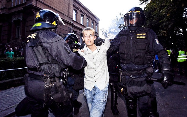 Po první rozbušce vržené z davu začalo horké hlavy chladit vodní dělo. Proti demonstrantům zasáhli muži zákona na koních i policisté se psy, ve vzduchu se objevil slzný plyn. Situaci monitorovaly dva vrtulníky.