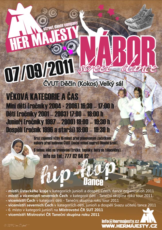 Neváhejte a dorazte na náš nábor. Staňte se tak členy naší velké rodiny, zažijete s námi spoustu legrace a naučíte se tančit. Pravidelně pořádáme a navštěvujeme taneční workshopy s těmi nejlepšími z ČR a světa, jezdíme na soutěže a tančíme pro veřejnost. Přijďte nás podpořit a pomoci nám v dobývání tanečního parketu.