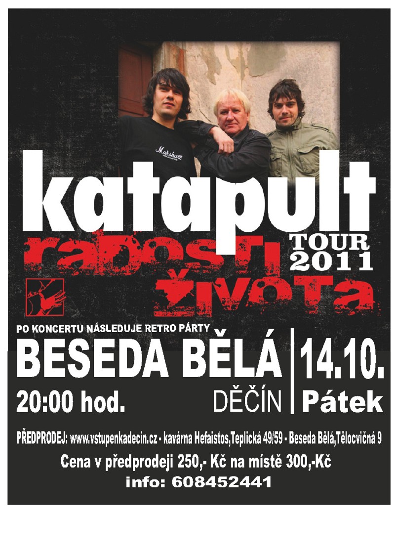 V pátek 14. října od 20 hodin se vrátí do Besedy v Bělé legendární Katapult. Ten zde vystoupí v rámci tour Radosti života, kde během dvouhodinového koncertu zahrají své největší hity. Vstupenky jsou v prodeji na www.vstupenkadecin.cz , v pokladně kina, divadla, Střelnice, v kavárně Hefaistos nebo přímo v Besedě. Další případné informace získáte na telefonu 608452441 nebo na plakátu v příloze.