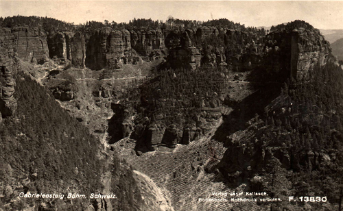 Historický záběr Českého Švýcarska po lesnické katastrofě: Následkem mniškové kalamity počátkem 20. let minulého století došlo k odumření lesů na 60 % území dnešního národního parku. Lidé se příliš nepoučili a založili nové smrkové monokultury (na snímku patrné jako řádky výsadeb).