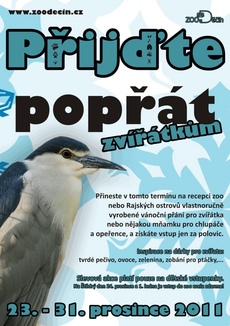 Děčínská zoologická zahrada přichystala pro své návštěvníky na závěr roku malý dárek. Na Štědrý den 24. prosince a Nový rok 1. ledna umožní všem vstup do zoo zcela zdarma a v období od 23. do 31. prosince pak nabídne dětské vstupné jen za polovinu běžné ceny. Podmínkou však v těchto dnech bude, že děti doma vyrobí a do zoo donesou zvířátkům vánoční přání nebo nějakou mňamku. Chlupáčkům a opeřencům lze nosit tvrdé pečivo, ovoce, zeleninu, zobání a další krmivo. Přijďte i vy popřát zvířátkům do děčínské zoo.
