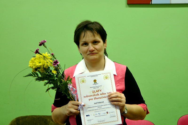 A konečně „Zlatou“ dobrovolnicí se stala paní Jana Vrabcová. Paní Jana dělala společnici klientce Slunečnice o.s. v programu Dobré odpoledne, jezdily na výlety, hrály společenské hry, chodily se společně starat o koně. Doprovázela dva dojíždějící klienty do tréninkového zaměstnání, jednou týdně navštěvovala 2 klientky v Domově pro osoby se zdravotním postižením, kde dělala např. i mikuláše. V současnosti dělá společnost dalšímu klientovi s mentálním postižením v programu Dobré odpoledne. Kromě toho vždy ochotně pomáhá s organizací festivalu Kramle, soutěže v 1. pomoci a taneční zábavě Slunečnice o.s. Jana skromně říká: „Práce dobrovolníka mě baví a chci se jí do budoucna věnovat“