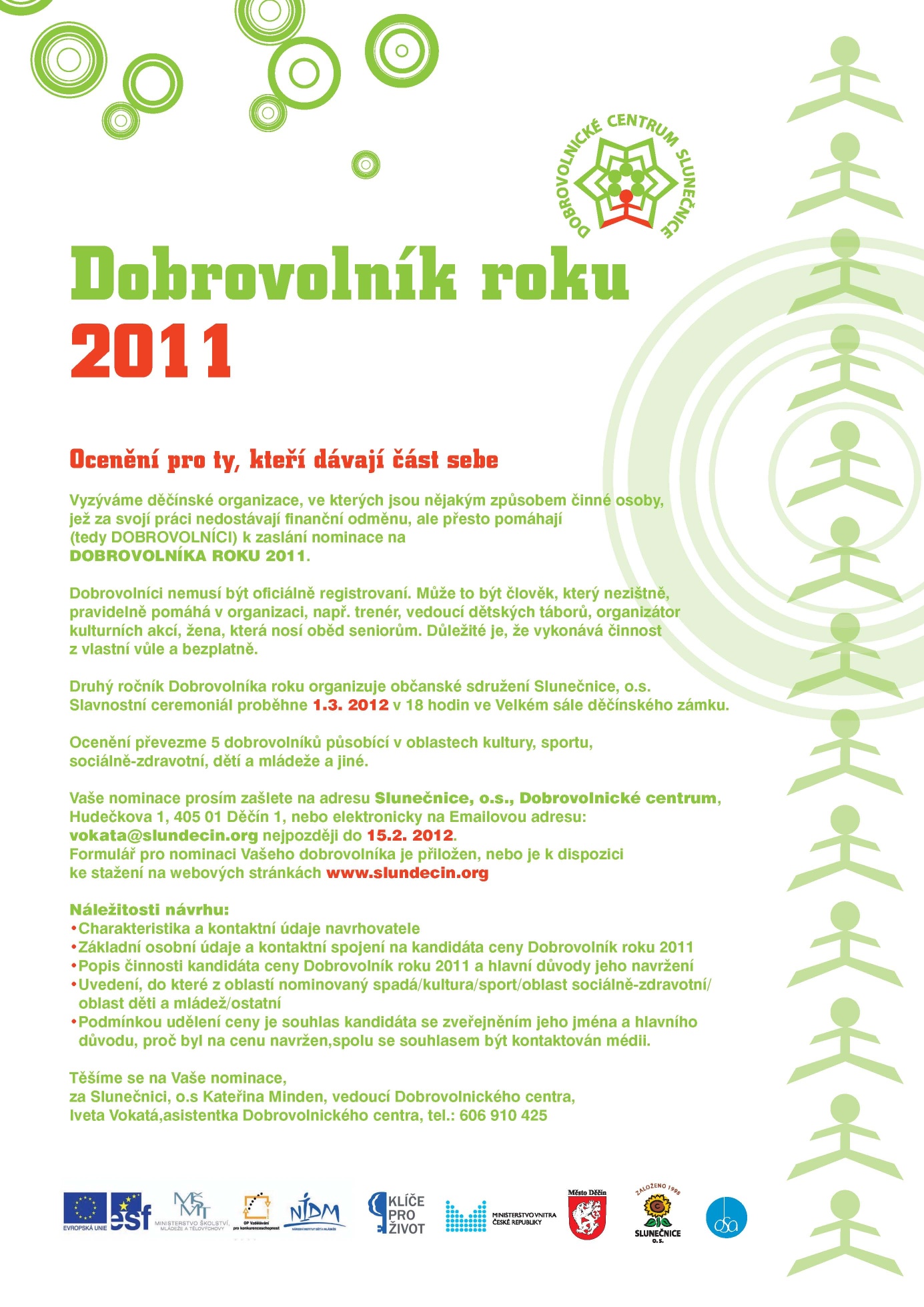 Po loňském úspěšném prvním ročníku ocenění „Dobrovolník roku města Děčína – Ocenění pro ty, kteří dávají část sebe“, si dovolujeme ze Slunečnice o.s. opět vyzvat děčínské organizace, ve kterých jsou nějakým způsobem činné osoby, jež za svojí práci nedostávají finanční odměnu, ale přesto pomáhají (tedy DOBROVOLNÍCI) k zaslání nominace na DOBROVOLNÍKA ROKU 2011. Dobrovolníci nemusí být v organizaci oficiálně registrovaní. Může to být člověk, který nezištně,pravidelně pomáhá ve Vaší organizaci, např. trenér, vedoucí dětských táborů, organizátor kulturních akcí, žena, která nosí oběd seniorům. Důležité je, že vykonává činnost z vlastní vůle a bezplatně.
