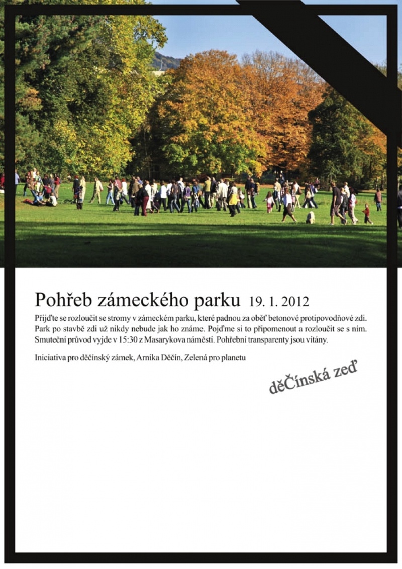 Děčínská občanská sdružení zvou občany města, aby se ve čtvrtek 19. ledna připojili k akci „Pohřeb zámeckého parku“., která má symbolicky vyjádřit nesouhlas s výstavbou betonové protipovodňové zdi na Mariánské louce. Smuteční průvod vyrazí v 15:30 z Masarykova náměstí směrem k místu, kde mají být stromy pokáceny. Zapálením svíčky mohou lidé vyjádřit zklamání nad současnou situací a upozornit vedení města, že s výstavbou betonové protipovodňové zdi na Mariánské louce nesouhlasí.