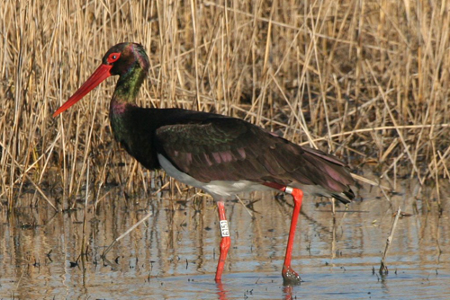Při hledání potravy: Čáp černý s kroužkem číslo 6151 z národního parku České Švýcarsko.