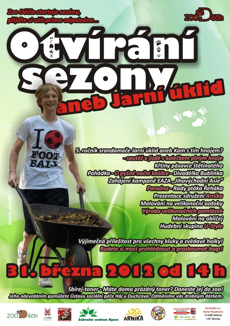 „V poslední březnový den by do zoo měli dorazit také všichni, kdo v sobě mají soutěžního ducha. Čeká nás totiž další ročník oblíbeného srandamače, kde bude hrát hlavní roli kolečko plné hnoje, rychlé nohy a především smysl pro humor. Soutěž s názvem Jarní úklid aneb Kam s tím hnojem? slibuje zábavu nejen soutěžícím, ale také divákům. Soutěžit mohou dospělí i děti,“ popsala mluvčí Zoo Děčín Alena Houšková. Toho, kdo se postaví na start, čeká jízda s kolečkem hnoje po vytyčené trase s několika občerstvovacími stanicemi v areálu zahrady. Běhat s voňavou nadílkou po zoo se bude v několika kategoriích – muži, ženy, děti nebo tříčlenné týmy. Kdo nastoupí na start „pracovně“ oblečen – v montérkách, holínkách, pracovních rukavicích – ten se může těšit na plusové body. Odměny pro soutěžící budou stylové. Vyhrát lze zahradní nářadí a náčiní. Hlásit se lze předem na telefonním čísle 412 531 164 nebo na e-mailu: info@zoodecin.cz nebo přímo na místě v den konání akce.