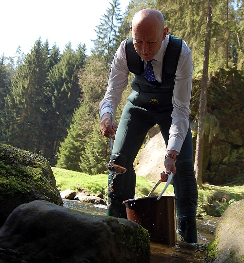Jetřichovice, 27. 4. 2012 – Rybáři a ochránci přírody vypustili do říčky Kamenice v Českém Švýcarsku 120 tisíc kusů plůdku lososa obecného. S vypouštěním pomohl také velvyslanec Norského království v Česku, Jeho Excelence Jens Eikaas, který České Švýcarsko pracovně navštívil, aby se blíže seznámil s adopčním programem Návrat lososů.