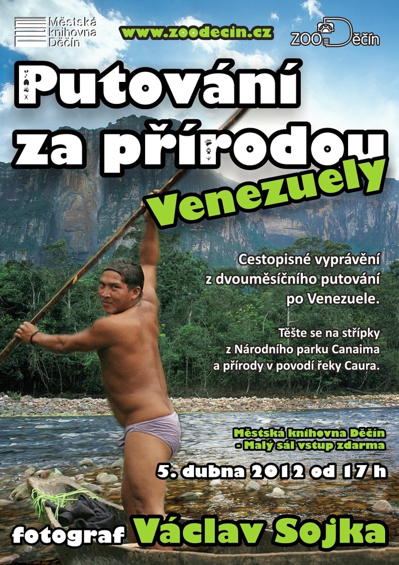 Cestopisné vyprávění z dvouměsíčního putování po Venezuele. Tak přesně takové téma čeká návštěvníky Městské knihovny Děčín, kteří dorazí tento čtvrtek 5. dubna v 17 hodin do malého sálu na přednášku pořádanou děčínskou zoologickou zahradu. Zajímavé povídání tentokrát povede fotograf Václav Sojka, který si připravil střípky z Národního parku Canaima a přírody v povodí řeky Caura. Přednáška je zdarma.