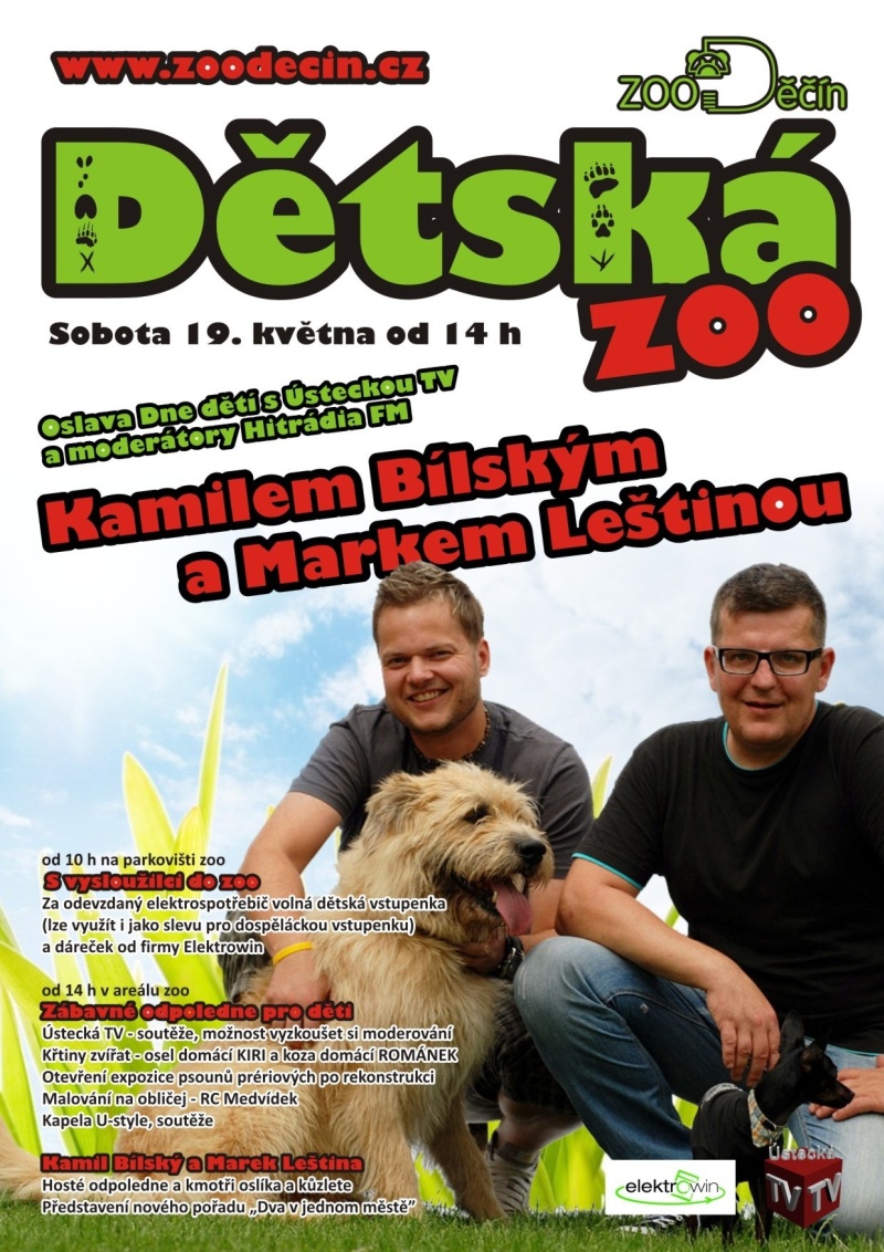 Již tuto sobotu oslaví děčínská zoologická zahrada svátek všech dětí. Chystá pro ně veselou akci s názvem Dětská zoo, na které nebudou chybět křtiny zvířat, soutěže ani zajímaví hosté. Akci pořádá zoo společně s Ústeckou TV, která během zábavného odpoledne představí moderátory Hitrádia FM – Marka Leštinu a Kamila Bílského i jejich nový pořad „Dva v jednom městě“. Moderátoři se stanou zároveň kmotry nově dovezené samičky osla domácího Kiri a kozlíka kozy domácí Románka a budou asistovat i při otevření nově zrekonstruované expozice pro psouny prériové a ursony kanadské. Dobroty předají také oslí slečně Emě, které se podařilo během uplynulého víkendu získat titul 2. NEJ mládě roku v soutěži Baby ZOOm 2012, kterou pořádala Unie českých a slovenských zoologických zahrada a kde se dokázala prosadit v konkurenci 13 krásných mláďat.
