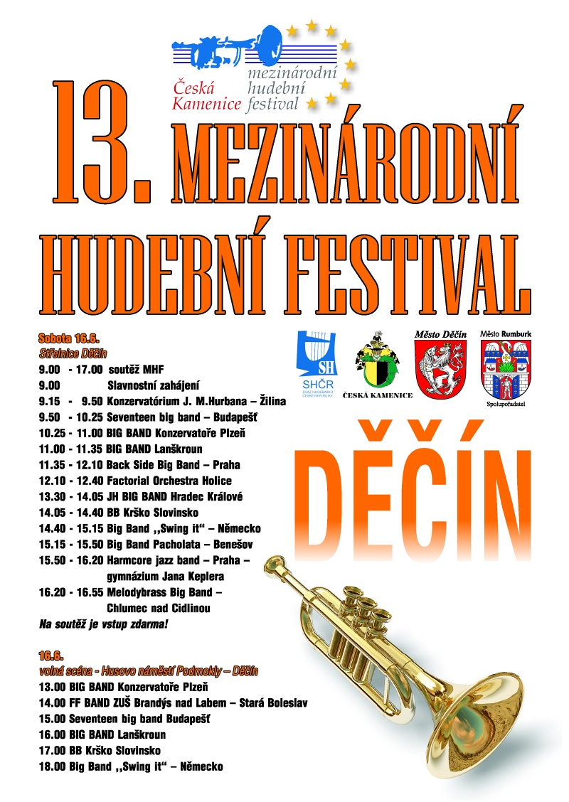 „Festival se konal od roku 2000 v Děčíně a postupně se přemístil do České Kamenice. V loňském roce se po letech do Děčína vrátil. Jsme tomu rádi, neboť kvalitní swingová hudba produkovaná soutěžícími orchestry má v Děčíně své příznivce. Velmi se těšíme na letošní soutěžní přehlídku,“ řekl náměstek primátora Pavel Sinko. Ve Společenském domě Střelnice se v sobotu 16. června od 9 hodin odehraje soutěž big bandů v kategorii nad 18 let. Představí se hudební tělesa z České republiky, Slovinska, Německa, Maďarska nebo Slovenska. Vstup je zdarma. Kromě Střelnice si posluchači budou moci kapely poslechnout i pod širým nebem od 13 do 18 hodin na Husově náměstí . Celý den bude v Děčíně zakončen slavnostním vyhodnocením soutěže a společenským večerem na Střelnici.