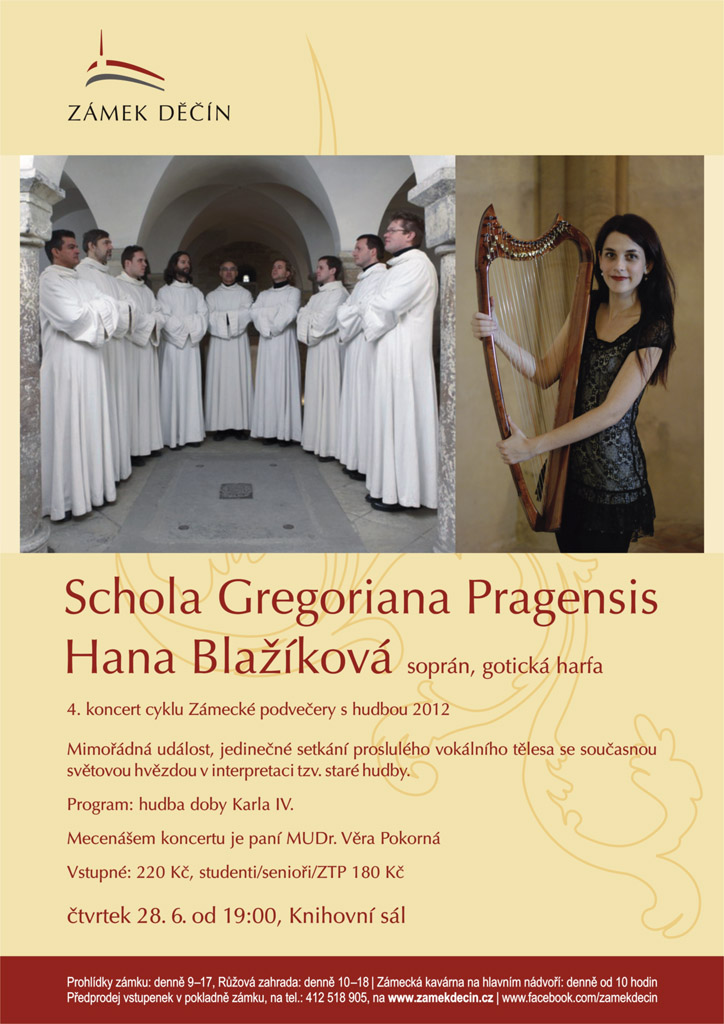 4. koncert cyklu Zámecké podvečery s hudbou nabídne jedinečný zážitek. V Knihovním sále v jižním křídle zámku vystoupí Schola Gregoriana Pragensis spolu s hvězdnou sopranistkou Hanou Blažíkovou. Program, souhrnně nazvaný „Hudba doby Karla IV.“ nás zavede na francouzský královský dvůr, uslyšíme milostnou středoevropskou hudbu a na okamžik nahlédneme i do prostorů starých katedrál. Hana Blažíková, která mistrně ovládá nejen svůj krásný hlas, ale také gesta se navíc doprovodí na repliku gotické harfy. Koncert se koná již tento čtvrtek 28. 6. od 19 hodin.