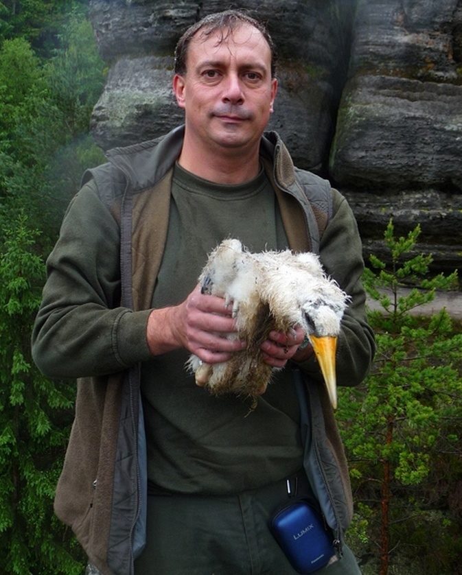 České Švýcarsko, 8. 6. 2012 – Svého stého čápa černého okroužkoval v Českém Švýcarsku dne 5. června 2012 ředitel Správy Národního parku České Švýcarsko a ornitolog Pavel Benda. Kroužkování slouží ke získávání poznatků ze života těchto tažných ptáků, v České republice zařazených mezi silně ohrožené druhy. Tyto poznatky pak ornitologové mohou využít pro účinnější ochranu čápů, jejichž populace se v regionu Českého Švýcarska vyvíjí slibně. V současné době zde hnízdí zhruba 10 párů.„Čáp černý je odlišně od svých bílých kolegů velmi plachý a nevyhledává blízkost člověka,“ říká Pavel Benda, ředitel Správy Národního parku České Švýcarsko, a dodává: „Skalnaté a zároveň lesnaté oblasti národního parku a jeho okolí jsou právě proto ideálním místem, kde se mu dostává potřebného klidu.“