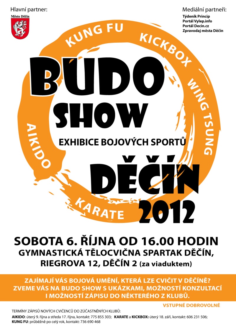 Občanské sdružení Aikido Ikeda Dojo Děčín pořádá ve spolupráci s Městem Děčín a dalšími kluby bojových umění z Děčína exhibici bojových sportů aikido, karate, kickbox, kung-fu a wing tsung. Akce pro širokou veřejnost s možností náborů nových cvičenců se uskueční v sobotu 6. října 2012 od 16.00 hodin v gymnastické tělocvičně Spartak Děčín v Riegrově ulici v Děčíně 2. Zájemci o bojové sporty z řad mládeže i dospělých si tak budou moci prohlédnout ukázky, konzultovat s trenéry a vybrat si sport, dle svého naturelu.