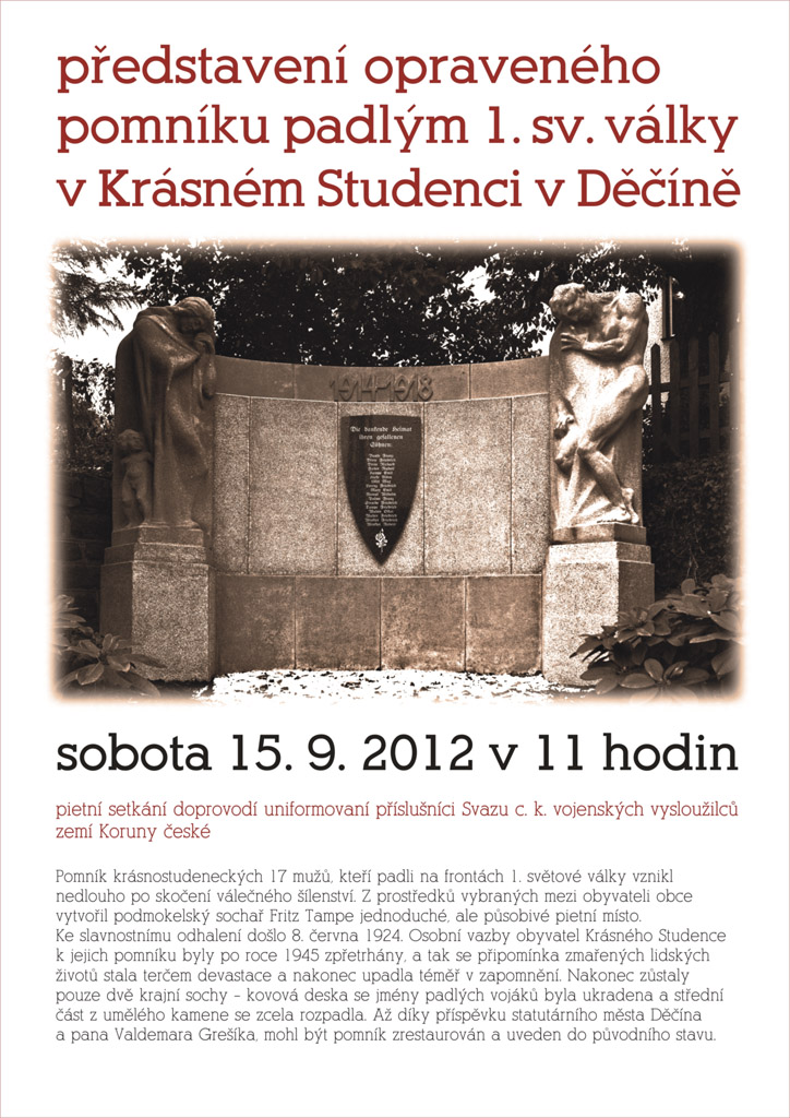 Rubriky Kultura Zprávy Odhalení pomníku padlým z 1. světové války v Krásném Studenci Autor příspěvku Autor: aleso Datum příspěvku 12/09/2012 Slavnostní odhalení opraveného pomníku padlým z 1. světové války v Krásném Studenci 15. 9. 2012 v 11:00. Sdílejte:Share Click to share on Facebook (Opens in new window) Facebook ← Nábor mládeže a cheerleaders → Události MP Děčín