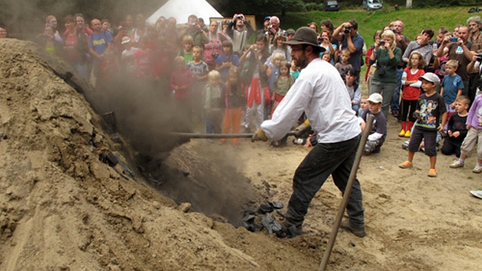 Dolský mlýn, 8. 9. 2012 – Dřevěné uhlí vypálené v milíři nedaleko Dolského mlýna během Týdne lesních řemesel získalo certifikát regionálního výrobku Českosaského Švýcarska. Návštěvníci sobotního slavnostního rozebírání milíře, kterých se sešlo zhruba 200, si tento unikátní regionální výrobek mohli odnést v připravených sáčcích domů jako praktický suvenýr. Prohlédnout si mohli také výsledky dalších pokusů, starobylými postupy vyrobenou potaš, smolu, dehet či šindele. Děti měly příležitost vyzkoušet si další dovednosti dávných předků, například lukostřelbu, řezání pilou “kaprovkou”, nebo práci s keramikou.