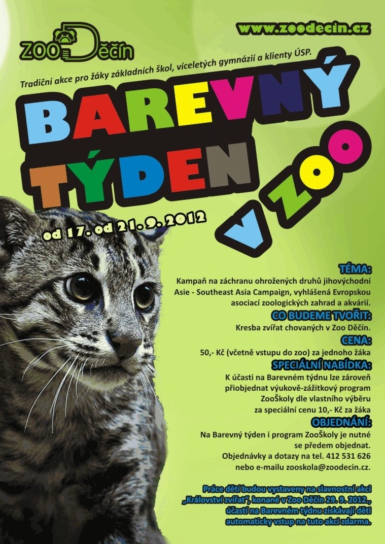 Rok se s rokem sešel a děčínská zoo opět chystá tradiční výtvarnou dílnu pod širým nebem s názvem Barevný týden. Ta je určena všem školákům základních škol a nižších ročníků gymnázií, ale také klientům ústavů sociální péče. Letošním tématem výtvarné dílny je Kampaň na záchranu ohrožených druhů jihovýchodní Asie – Southeast Asia Campaign, vyhlášená Evropskou asociací zoologických zahrad a akvárií. „Spoustu zvířat, kterými se kampaň zabývá, chováme i v naší zoo a proto se při kreslení zaměříme právě na ně. Našimi objekty zájmu se stane například kočka rybářská, papoušek kakadu, sambar skvrnitý, medvěd malajský, makak chocholatý, prase visajanské, krajta mřížkovaná a spousta dalších.“ uvedla mluvčí zoo Alena Houšková.