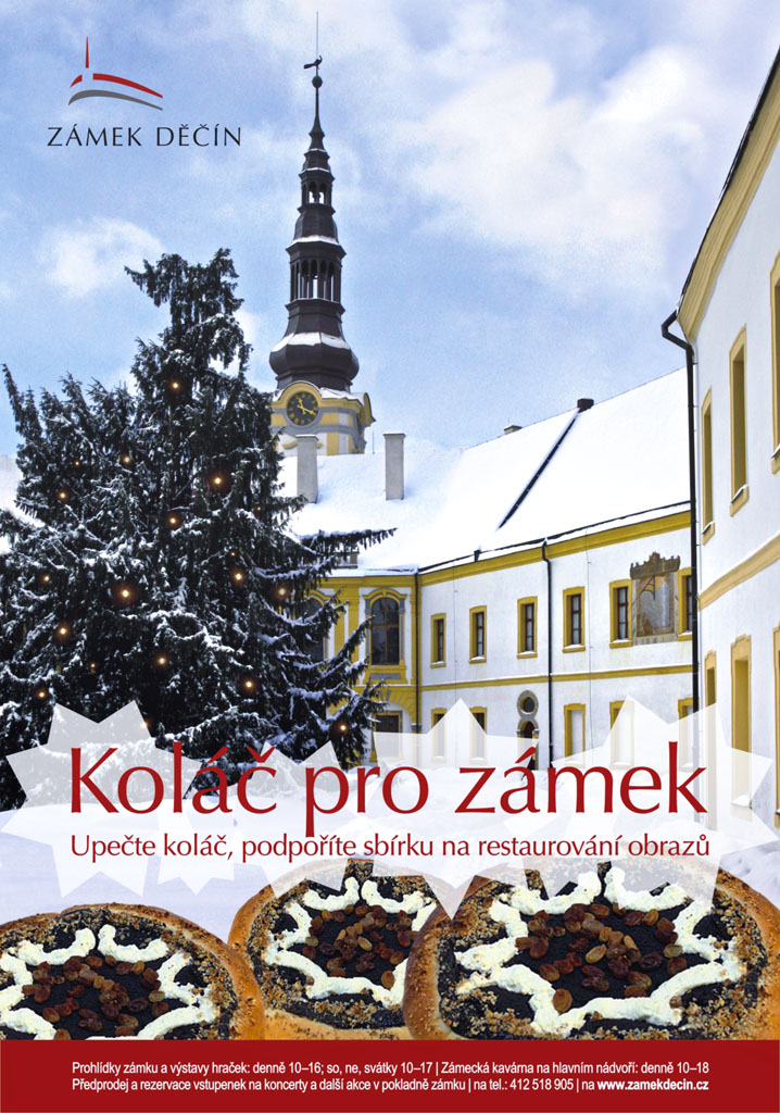 Před rokem zhruba v tomto čase vyhlásila správa zámku akci Koláč pro zámek, která se setkala s nečekaně velkou odezvou. O adventním trhu tak v improvizované kavárně bylo možno ochutnat několik desítek nejrůznějších buchet, koláčů, cukroví a jiných pochoutek. Výtěžek akce byl poté převeden na konto veřejné sbírky na restaurování obrazů z někdejší zámecké sbírky, která celkově vynesla na 200 tis. Kč. V průběhu roku 2012 bylo z těchto prostředků zrestaurováno hned několik cenných exponátů. Prvním se stal mimořádně hodnotný portrét Španělské dámy – infantky Marie Anny Habsburské – z okruhu slavného barokního mistra Diega Velázqueze. Ve druhé polovině roku přišel na řadu také jeho protějškový portrét – podobizna císaře Ferdinanda III., pozdějšího manžela princezny Marie Anny. Z výnosů veřejné sbírky mohl dále být zrestaurován například renezanční obraz Korunování Panny Marie z roku 1573 s podobiznou donátorky, abatyše Kateřiny Thunové, portrét hraběte Friedricha Brühla z poloviny 18. století či pastelové podobizny Václava Josefa Thuna a jeho manželky Marie Anny Libštejnské z Kolowrat z roku 1785. Všechny tyto obrazy se stanou součástí nové expozice v jižním křídle, která by se měla návštěvníkům otevřít v příštím roce. Již letos vyhlásila správa zámku novou veřejnou sbírku, jejíž výnos by měl tentokrát přispět k obnově sochařských památek. Jedná se například bývalé figurální kašny před hlavním průčelím či sochařskou výzdobu Růžové zahrady. Vesměs jde o cenné umělecké artefakty na pohledově výrazných místech, na které se během rekonstrukce zatím nedostalo či poněkud zvláštně pozapomnělo. Po velkém úspěchu loňského dobročinného pečení nemůže nová sbírka odstartovat lépe než druhým ročníkem akce Koláč pro zámek. I letos proto prosíme všechny příznivce zámku – pokud chcete pomoci obnově děčínského zámku, upečte doma dobrý koláč, dort či jiný zákusek a věnujte ho do dobročinné kavárny, která se otevře během adventního trhu na děčínském zámku v neděli 16. prosince 2012. Pokud sami nepečete, můžete pomoci tím, že si během adventních trhů sami nějaký sladký výtvor zakoupíte. Speciální dobročinná kavárna bude tentokrát umístěna v přízemí nově zrekonstruovaného jižního křídla v prostoru budoucí restaurace.