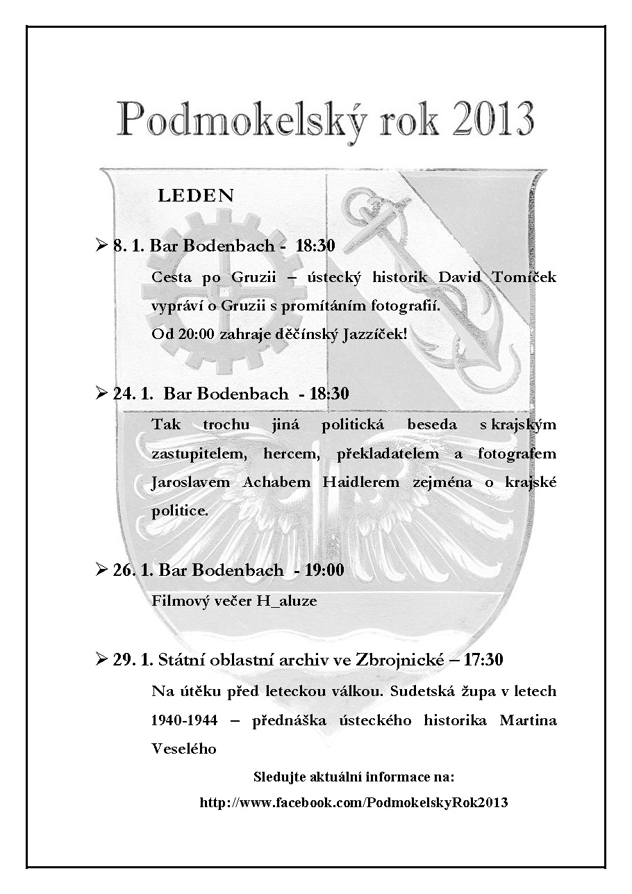 A na co vše se můžete v roce 2013 z naší strany těšit? Tak jen namátkou – do Podmokel budete moci v tomto roce vyrazit za odbornými, ale i méně vážnými přednáškami nejen z historie. Nebudou chybět koncerty či filmové večery. Na levém břehu Labe se letos bude konat mimo jiné také zavedený literární festival Zarafest. Myslíme také na nejmenší, pro něž chystáme akce na jaro. Rokem 2013 nás bude provázet velká fotografická amatérská soutěž, která bude vyhlášena koncem ledna. Vyplatí se nás tedy určitě sledovat – více na www.facebook.com/PodmokelskyRok2013, případně nás můžete kontaktovat na podmokly2013@gmail.com.