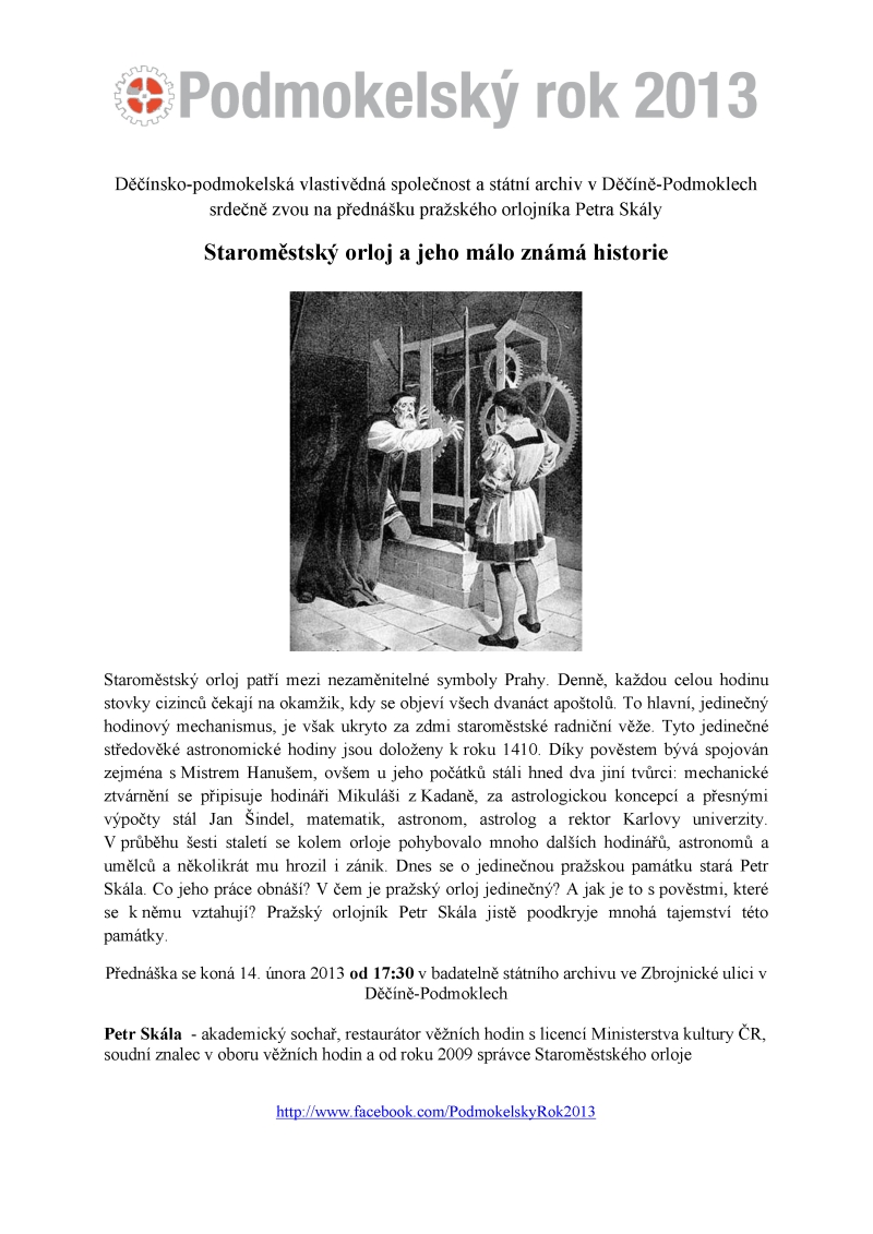 Děčínsko-podmokelská vlastivědná společnost a státní archiv v Děčíně – Podmoklech zve na přednášku pražského orlojníka Petra Skály: Staroměstský orloj a jeho málo známá historie, která se koná ve čtvrtek 14. února 2013 od 17.30 v badatelně státního archivu v Děčíně-Podmoklech ve Zbrojnické ulici.