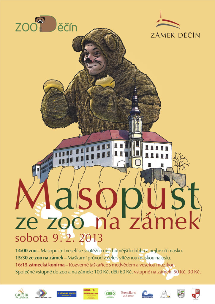 Také letos jsme o masopustním čase spolu s děčínskou zoologickou zahradou pro Vás připravili odpoledne plné taškařic. V zoo se od 14:00 koná tradiční masopustní soutěžení o nejchutnější koblihu a nejpovedenější masku, které vyvrcholí v 15:30 odchodem masopustního průvodu na zámek. Kolem 16:15 přivítáme průvod v čele s vítěznou maskou na oslu i oblíbeného medvěda v zámecké konírně. Tam bude nad neposedným taškářem vykonán spravedlivý soud. Správně tušíte, že i tentokrát nakonec dostane milost, a proto se můžete těšit také na rozvernou divadelní pohádku „Jak šel Honza do světa“, horký čaj, koláče a jiné dobroty i příjemnou muziku v podání skupiny Teens Band.