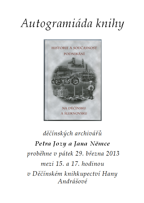 Autogramiáda archivářů Jana Němce a Petra Jozy a jejich nového díla s názvem Historie a současnost podnikání na Děčínsku a Šluknovsku. Autogramiáda se koná tento pátek 29. března mezi 15. a 17. hodinou v Děčínském knihkupectví paní Andrášové v Podmoklech.