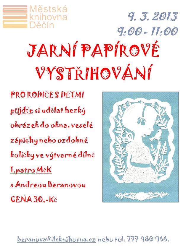 Městská knihovna Děčín Vás zve dne 9.března od 9 hodin na „Jarní papírové vystřihování“. Přijďte si udělat hezký obrázek do okna, veselé zápichy nebo ozdobné kolíčky. Vede Andrea Beranová. Pro rodiče s dětmi. Vstup 30 Kč.