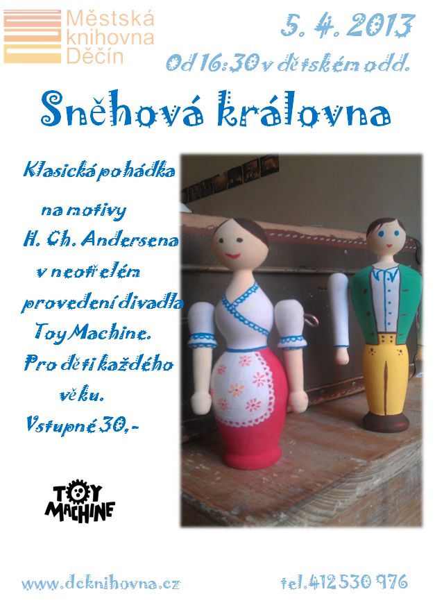 Rubriky Zprávy Sněhová královna Autor příspěvku Autor: aleso Datum příspěvku 27/03/2013 místo: Knihovna datum: 05.04.2013 16:30 objednat Městská knihovna Děčín si Vás dovoluje pozvat dne 5. dubna od 16:30 hodin na klasickou pohádku „Sněhová královna“ na motivy H. Ch. Andersena v neotřelém provedení divadla Toy Machine. Vstup 30 Kč. Štítky knihovna ← Ledňáček /D1/ → Historie a současnost podnikání