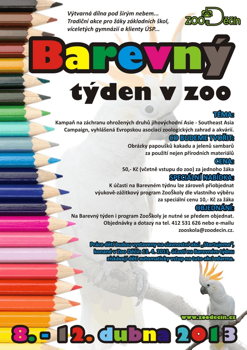 Barevný týden je aktivita vhodná pro žáky základních škol a také kolektivy ústavů sociální péče. Školáci při něm dostávají možnost přijít tvořit do areálu zoo mezi zvířata. Téma tvoření se přitom vždy opírá o právě probíhající kampaň Evropské asociace zoologických zahrad a akvárií EAZA, která je pro letošek zaměřena na ochranu zvířat z Jihovýchodní Asie. Žáci se při návštěvě zoo seznámí nejen s problematikou kampaně, ale také si vyzkouší zajímavou techniku tvoření. Letos budou za použití lepidla mouky a kokosové drti tvořit obrázky papouška kakadu žlutolícího sumbského a kopytníka sambara skvrnitého. Právě to jsou totiž zvířata, kterých se problematika kampaně dotýká a jež mohou návštěvníci v zoo vidět na vlastní oči. Účast na Barevném týdnu v Zoo Děčín může být možností, jak se připojit k oslavám Dne Země.