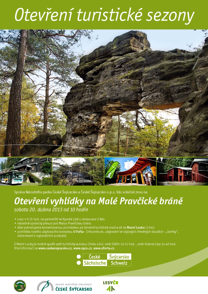 V sobotu 20. dubna od 10 hodin odstartujeme letošní turistickou sezonu spolu se Správou Národního parku České Švýcarsko slavnostním otevřením nově vybudované vyhlídky na Malé Pravčické bráně. Na rozdíl od její větší sestry se tak návštěvníci mohou projít nad obloukem tohoto skalního okna. V oblasti Vysoké Lípy a Mezní Louky tak turistům začne v těsné blízkosti skalního hrádku Šaunštejn plnohodnotně sloužit nový výletní cíl. Sraz všech účastníků je u autobusové zastávky ve Vysoké Lípě v 9.15 hod, kde čekáme na příjezd turistických autobusů ze směru od Děčína i Krásné Lípy. V rámci slavnostního programu při otevření vyhlídky představíme i zbrusu nové turistické publikace: Turistický magazín Zážitky v Českosaském Švýcarsku a brožuru Jízdních řádů turistických autobusů, vlaků, lodí a přívozů jak v Českém tak i v Saském Švýcarsku. Z Malé Pravčické brány pak budeme pokračovat komentovanou procházkou na Mezní Louku, kde si budete moci prohlédnout nový a zajímavý typ ubytovacího zařízení tzv. Seníky U Fořta a navštívit informační středisko při vstupu na Gabrielinu stezku vedoucí až na Pravčickou bránu.
