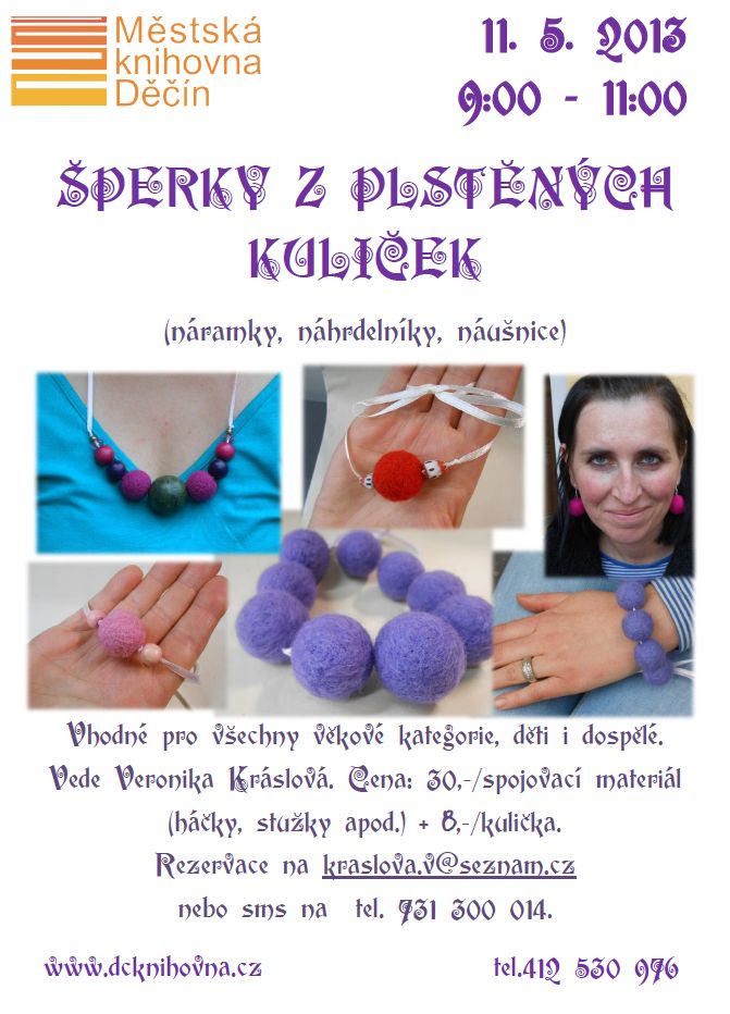 11. 5. 9-11 h (náramky, náhrdelníky, naušnice). Vhodné pro všechny věkové kategorie, děti i dospělé. Vede Veronika Kráslová. Cena: 30,-/spojovací materiál (háčky, stužky apod.) + 8,-/kulička. Rezervace na kraslova.v@seznam.cz nebo sms na tel. 731 300 014.