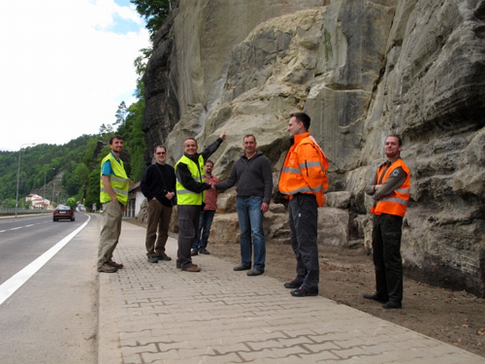 Hřensko, 21. 5. 2013 – Správa Národního parku České Švýcarsko dnes ve Hřensku převzala od firmy ARCADIS Geotechnika a.s. sanovaný skalní objekt, který od konce roku 2010 komplikoval dopravu na mezinárodní silnici I/62. Silnice je počínaje dneškem oficiálně průjezdná bez jakéhokoli omezení, bezpečný je opět také pohyb pěších po chodníku u paty skály. Skalní blok nyní stabilizují železobetonový věnec a padesát ocelových kotevních trnů, pukliny jsou vyplněny betonem, jeho povrch částečně pokrývají ocelové sítě. Proti pádu menších bloků ochrání řidiče i pěší nově instalované záchytné ploty. Předání sanované skály proběhlo proti původnímu harmonogramu o deset dnů dříve.