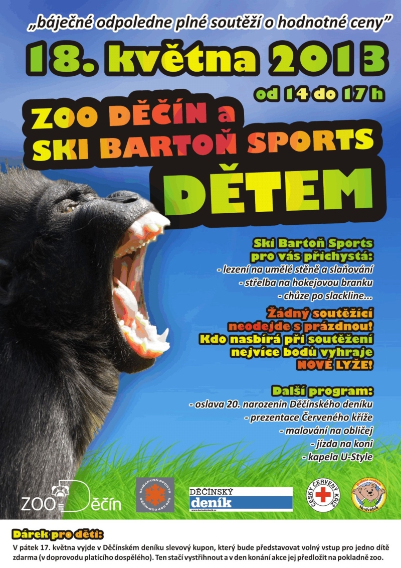 Návštěvníky čeká báječné sobotní odpoledne, které připravila zoo společně se Ski Bartoň Sports. „Příchozí se mohou těšit na zábavné odpoledne se spoustou her a soutěží, při kterých bude možné získat hodnotné ceny, ale také znalosti a dovednosti. Na programu budou různé soutěže, jako např. lezení na umělé stěně a slaňování, střelba na hokejovou branku, chůze po slackline, a další,“ prozradila mluvčí zoo Alena Houšková. Ski Bartoň Sports slíbil, že žádný ze soutěžících neodejde s prázdnou! Soutěže budou bodovány, a kdo nasbírá nejvíce bodů, vyhraje nové lyže! Proto určitě neváhejte a zarezervujte si ve svém kalendáři sobotu 18. května jako den, který strávíte právě v děčínské zoo. Slavit se v tento den bude v zoo opravdu ve velkém! Kromě svátku dětí totiž návštěvníci oslaví taktéž i jedny významné narozeniny. Přesně 20 let jsou totiž na světě oblíbené noviny, které pro vás denně připravují zpravodajství z celého okresu. „Kulatiny s námi v sobotu oslaví Děčínský deník. Jeho tým pro děti připravil nejen velkou soutěž o ceny, ale také dá dětem k jejich svátku společně se zoo dárek v podobě volného vstupu na tuto akci. Jedinou podmínkou k jeho získání bude nutnost koupit si v pátek 17. května Děčínský deník se slevovým kuponem, ten vystřihnout a pak ho v sobotu 18. května předložit na pokladně zoo. Volná vstupenka bude platná pro jedno dítě v doprovodu jednoho platícího dospělého,“ doplnila mluvčí zoo.