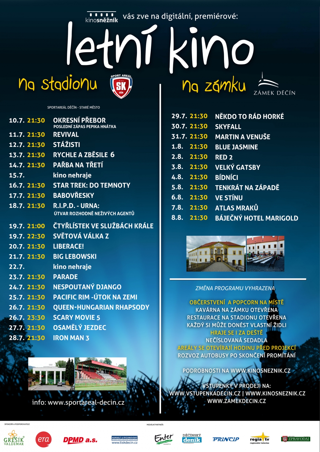 Hraje se i za deště. Areály budou otevřeny vždy hodinu před začátkem projekce, která až na jednu výjimku bude začínat ve 21:30. Jsme ale závislí na přírodě, a tak je možné posunutí začátku do úplného setmění.