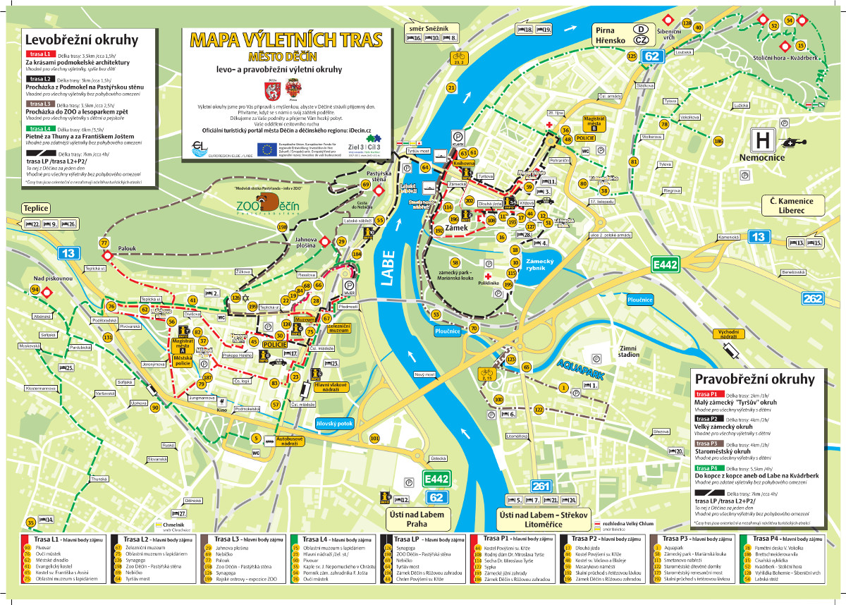 Město Děčín připravilo mapu výletních okruhů po městě Děčín. Nabízí celkem devět barevně značených okružních tras – čtyři pro levobřežní část města s označením L1 – L4 (Podmokly a blízké okolí), čtyři pro pravobřežní část města s označením P1 – P4 (Děčín a blízké okolí) a jeden, který propojuje obě části města přes Tyršův most. Ten má označení LP.