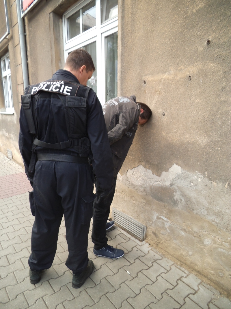 „Na místě hlídka zjistila, že jde o jí dobře známého muže, se kterým již strážníci v minulosti řešili řadu prohřešků. Hlídka zadrženého od občanů převzala a omezila jej na osobní a svobodě. Vzhledem k obavě, že by se muž mohl pokusit o útěk, mu strážníci nasadili pouta a prověřili, zda u sebe nemá zbraň,“ uvedl ředitel děčínské městské policie Marcel Horák. Dodal, že vzhledem k osobě pachatele museli strážníci při prohlídce postupovat velmi opatrně. To se jim nakonec vyplatilo, muž měl totiž u sebe několik injekčních stříkaček používaných pro aplikaci drog a lovecký nůž.