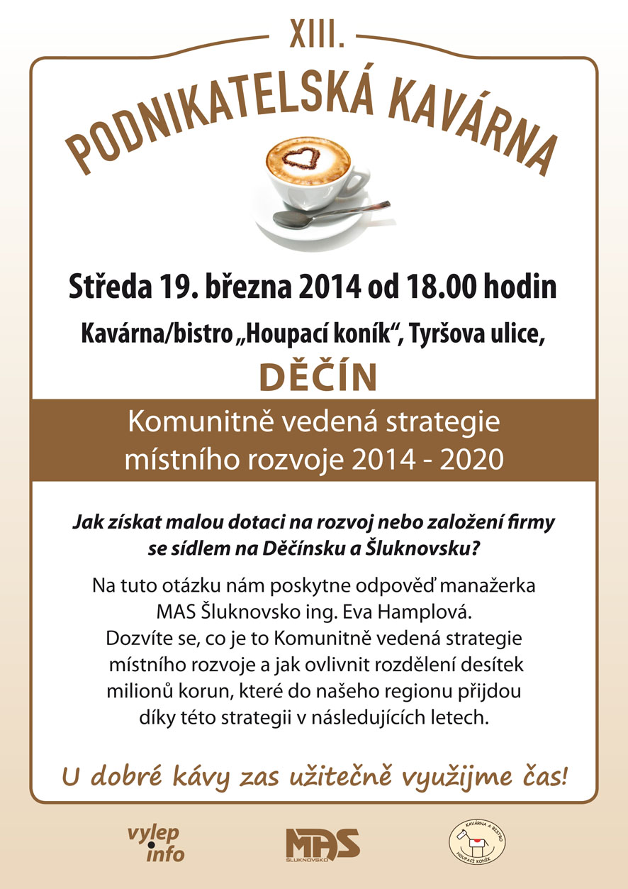 Portál Vylep.info zve všechny příznivce malého a férového podnikání v našem regionu na třináctou Podnikatelkskou kavárnu, která se uskuteční v bistru Houpací koník na Tyršovo ulici ve středu 19. března od 18 hodin. Řeč bude o tom, jak získat v příštích letech finanční podporu na zajímavý projekt prostřednictvím komunitně vedené strategie místního rozvoje.