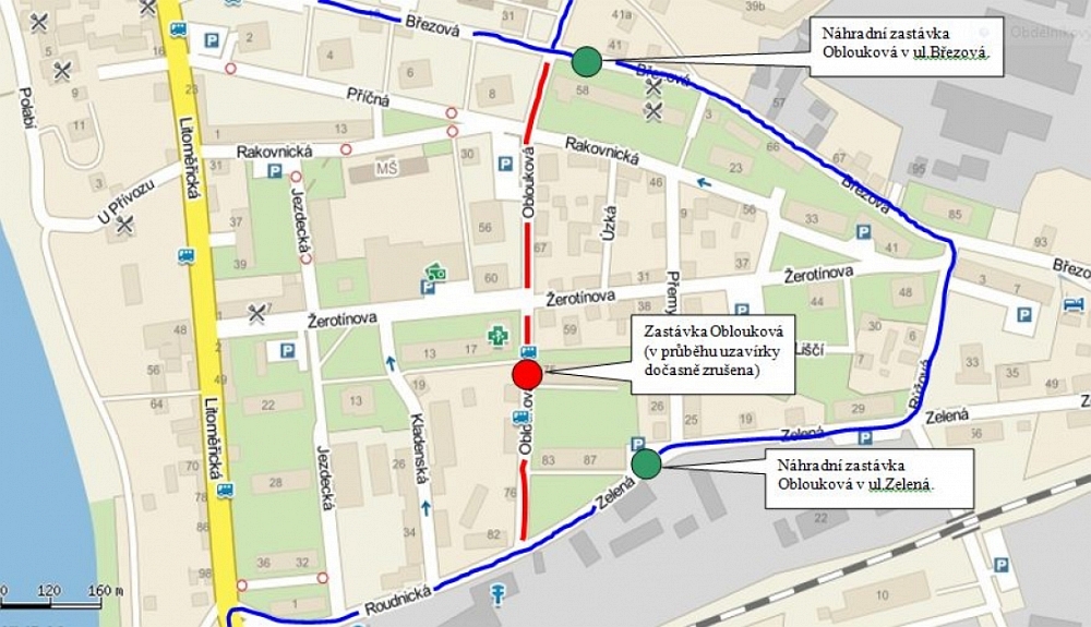V nejbližších dnech dojde k uzavření Obloukové ulice mezi ulicí Březová a Zelená také pro autobusy městské hromadné dopravy. Zastávky budou vedeny po objízdné trase vyznačené na přiložené mapce. Uzavírky a dopravní omezení ulic na Starém Městě se mění podle probíhajících prací Revitalizace sídliště Staré Město v rámci projektu IPRM. Projekty, které jsou v současné době schváleny, by měly dokončeny do konce letošního roku.