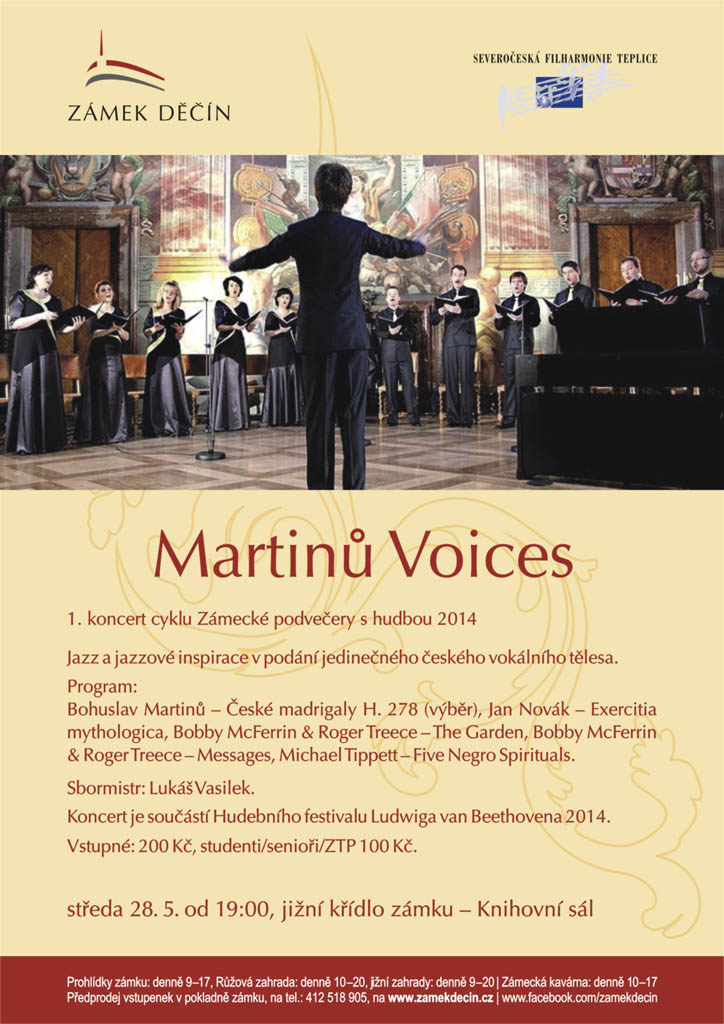 Celý koncertní cyklus ovšem otevře těleso neméně zajímavé. V rámci Hudebního festivalu Ludwiga van Beethovena přivítá děčínský zámek vokální soubor Martinů Voices. Navzdory svému názvu se toto uskupení nevěnuje zdaleka jen interpretaci díla českého klasika 20. století. Důkazem bude i děčínský koncert, při kterém během jednoho večera zazní jak Madrigaly Bohuslava Martinů, tak jazzové či jazzem inspirované skladby. Tato dramaturgie plně odráží filozofii souboru, jenž vychází z českých tradic, které ovšem mísí se světovou hudbou nejrůznějších časových období – od renesance po nejnovější trendy 21. století. Martinů Voices pracují pod vedením sbormistra Lukáše Vasilka a jejich vystoupení jsou pro posluchače vždy mimořádným zážitkem.