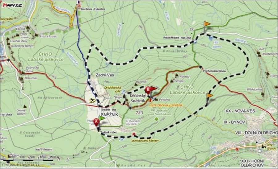A – start u kaple Panny Marie v obci Sněžník
