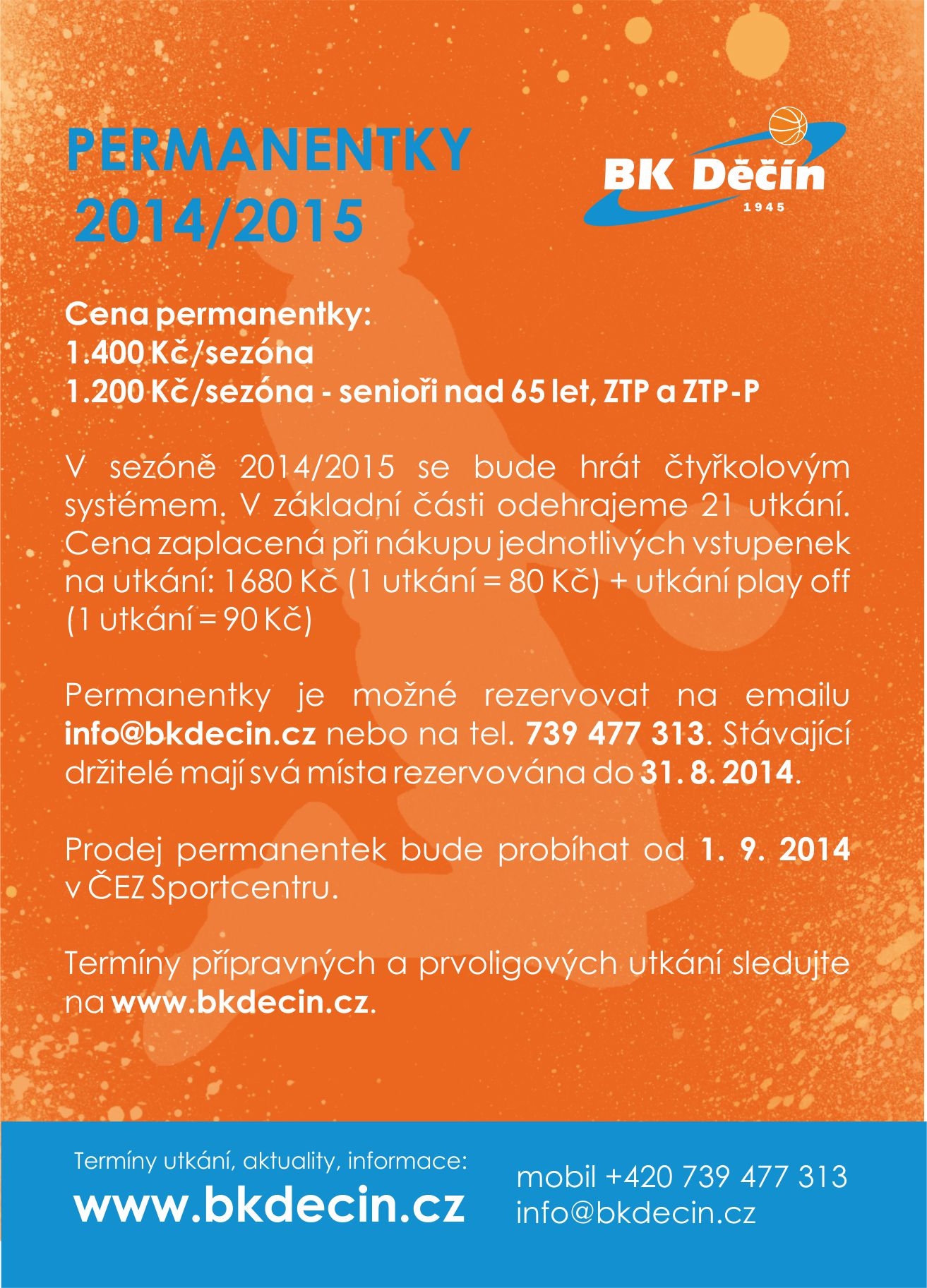 Permanentky je možné rezervovat na email info@bkdecin.cz nebo 739 477 313. Stávající držitelé mají svá místa rezervovány do 31. 8. 2014. Prodej permanentek bude probíhat od 1. 9. 2014 v ČEZ Sportcentrum.