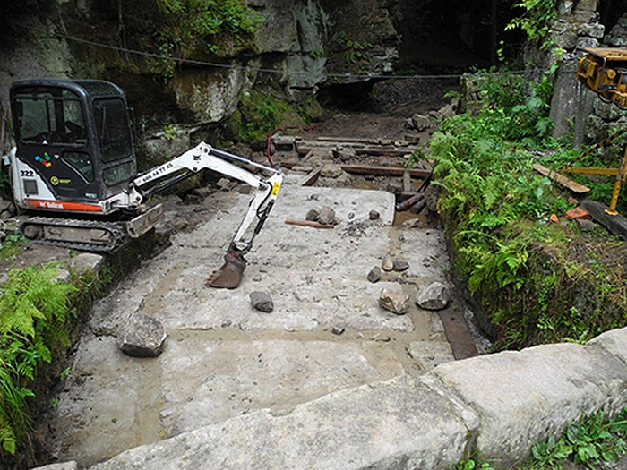 Omezení kvůli stavebním pracím v areálu Dolského mlýna v tomto týdnu skončila. Areál je tedy návštěvníkům opět přístupný bez dalších omezení. Opravu havarijního zdiva dymníku černé kuchyně i dláždění náhonu se podařilo dokončit s více než týdenním předstihem. Dodavatelům CHEOPS DC a SPELEO – Řehák děkujeme za rychlé provedení prací, byť jim počasí příliš nepřálo.