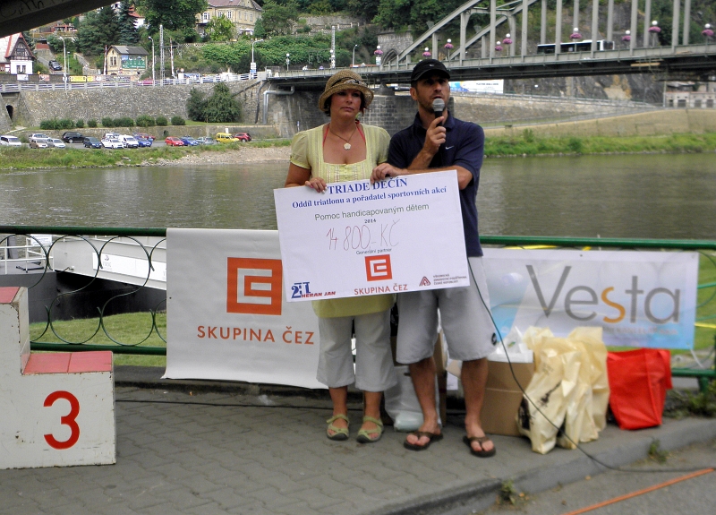 Triatlonový oddíl Triade Děčín každoročně podporuje handicapované děti. I letos tomu nebylo jinak. Šek v hodnotě 14 800,- Kč byl slavnostně předán Markem Peterkou předsedou oddílu Triade Haně Pacinové z Mateřského centra Bělásek. Tyto finance dále poputují těm, kteří to nejvíce potřebují tj. rodinám s handicapovanými dětmi. Díky spolupráci obou organizací bylo přerozděleno již 150 tisíc Kč.