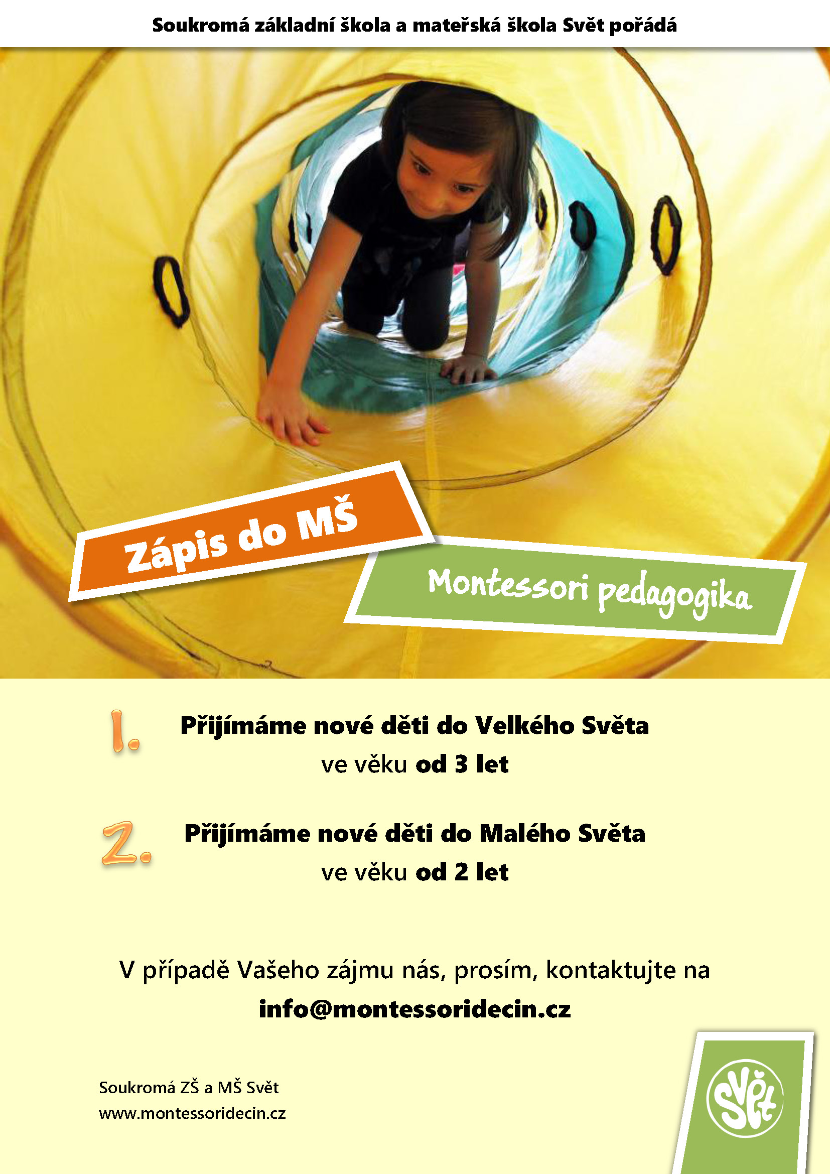 Rubriky Dětem Zprávy Zápis do MŠ Svět Autor příspěvku Autor: aleso Datum příspěvku 26/08/2014 Soukromá základní škola a mateřská škola Svět pořádá zápis do MŠ. Sdílejte:Share Share on Facebook (Opens in new window) Facebook Štítky školy ← Ironman 70,3 Budapešť 2014 → Poslední dva víkendy s Kozí dráhou + Mariánské slavnosti v Krupce