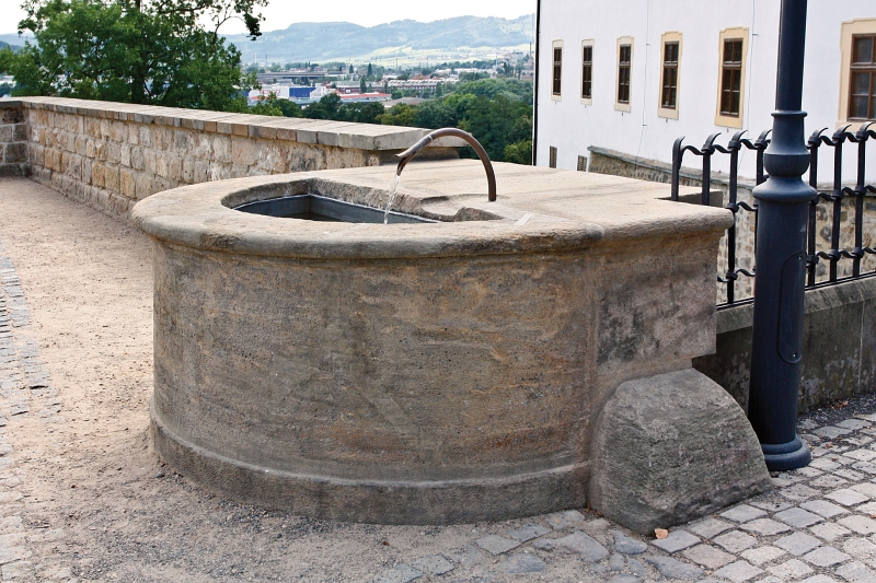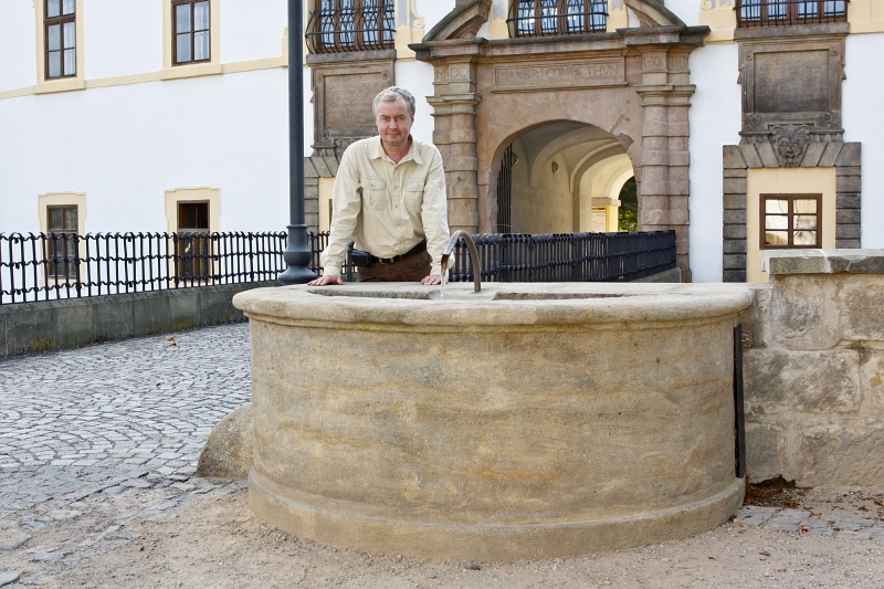 Jedním z nich až donedávna byly také poškozené pískovcové nádrže na prvním nádvoří. Jde o pozůstatek původních kašen, které od roku 1816 krášlily pohled na hlavní zámecké průčelí. Jejich podobu navrhl drážďanský dvorní architekt Christian Schuricht. Kašny původně tvořily dvě pískovcové ženské postavy držící nádoby, ze kterých prýštila voda do zmíněných nádrží. Vytvořením soch byl pověřen známý český klasicistní sochař Václav Prachner. Až do poloviny 90. let tvořily obě kašny důležitou součást pohledu na vstupní partie děčínského zámku.